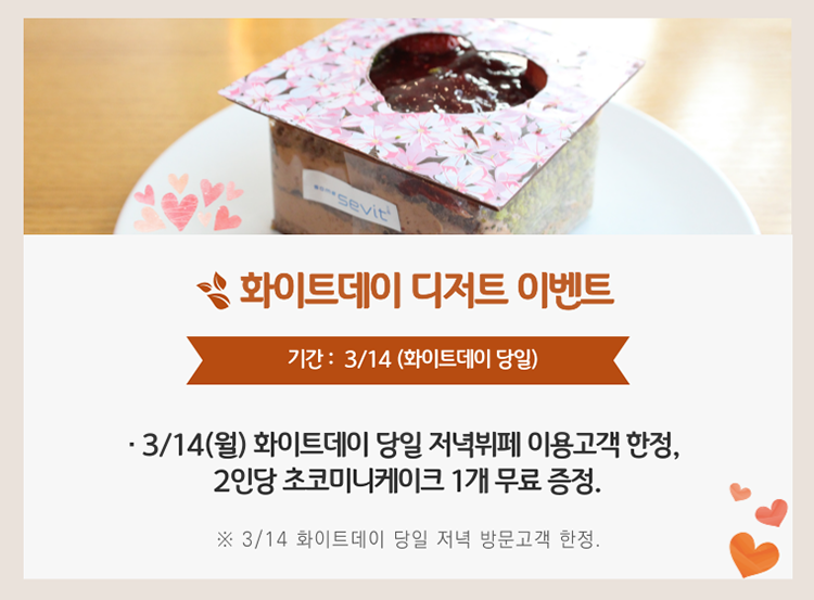 그리고 화이트데이에 채빛퀴진에서 달콤한 시간을 보내실 수 있도록 준비했어요. 3월 14일 화이트데이 당일 저녁뷔페 고객에게는 2인당 초코미니케이크 1개를 무료로 드리거든요.