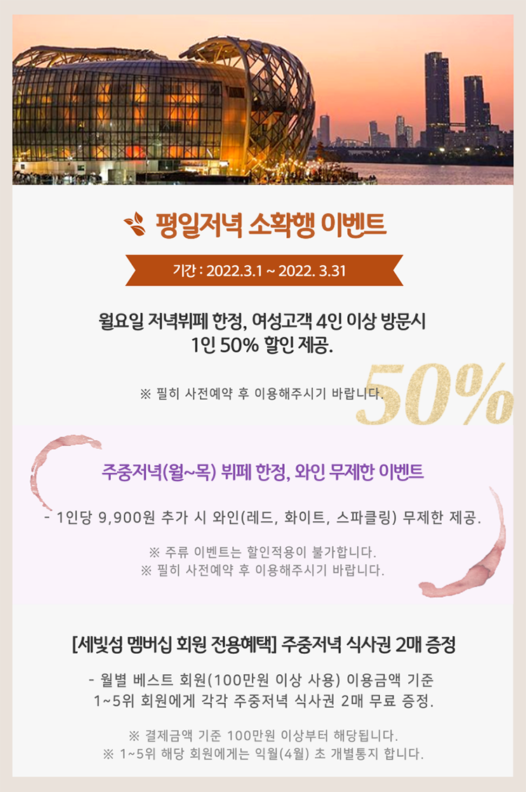 | [세빛섬] 아름다운 세빛섬에서 아름다운 시간을! 2월 프로모션 (0) | 2022.02.08 |