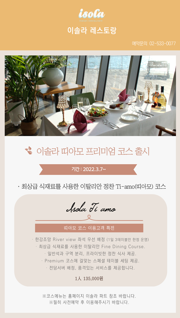 이솔라 레스토랑에서는 3월 7일부터 이솔라 띠아모 프리미엄 코스를 출시합니다. 최상급 식재료를 사용한 이탈리안 정찬인 띠아모 코스 이용 고객에게는 한강뷰 좌석을 배정하고 프라이빗한 정찬 식사와 스페셜 테이블 세팅, 전담 서버로 품격 있는 서비스를 제공합니다.