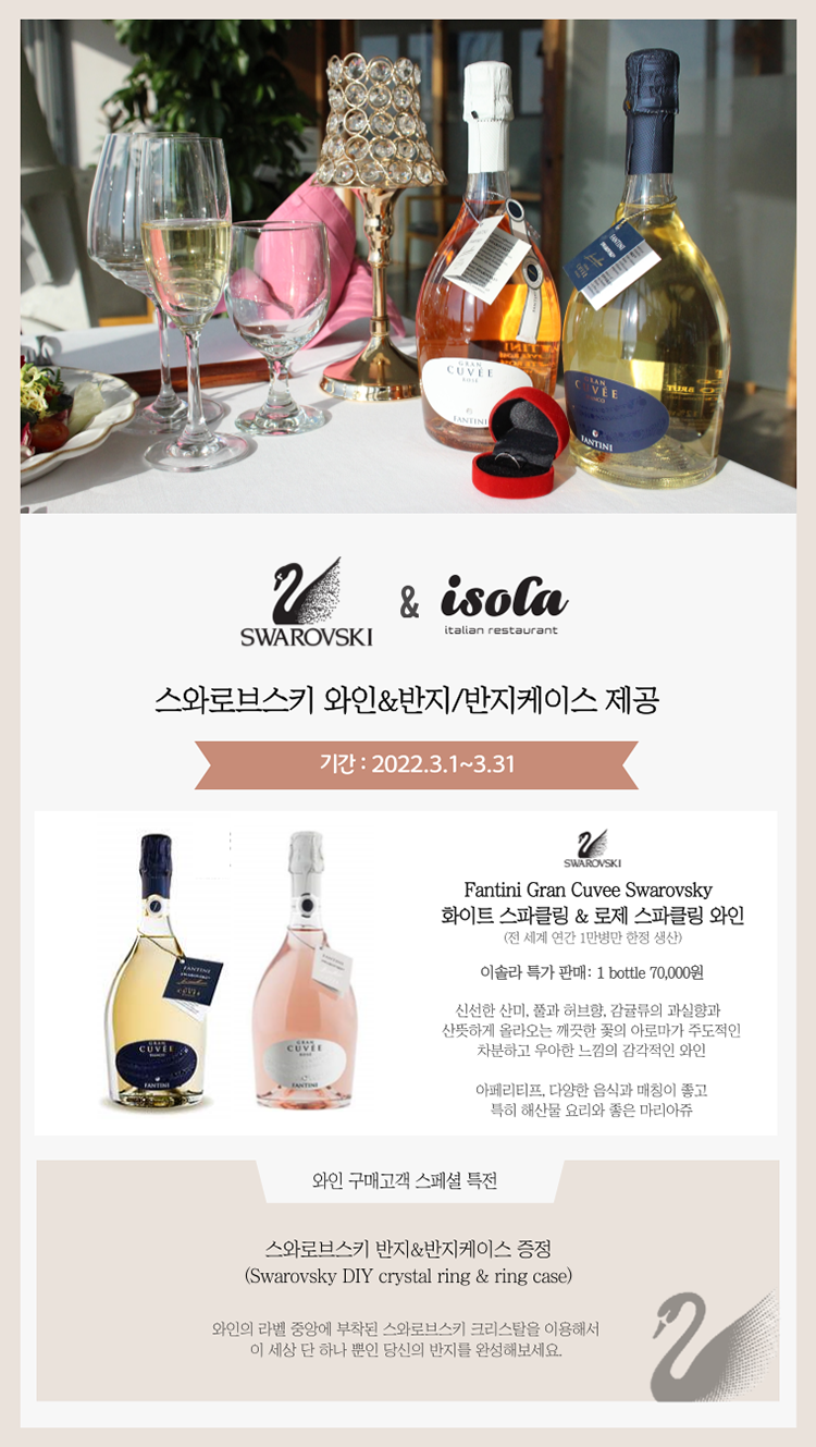 이솔라는 스와로브스키와 함께하는 이벤트도 준비했습니다. 3월 동안 스와로브스키 화이트 스파클링, 로제 스파클링 와인을 한 병에 70,000원 특가로 판매합니다. 차분하고 우아한 느낌의 감각적인 와인으로, 전 세계 연간 1만 병만 한정 생산하죠. 특히 와인 구매 고객에게는 스와로브스키 DIY 반지와 반지케이스를 증정합니다. 와인 라벨 중앙에 부착된 크리스탈을 이용해서 세상에 단 하나뿐인 반지를 완성할 수 있어요.
