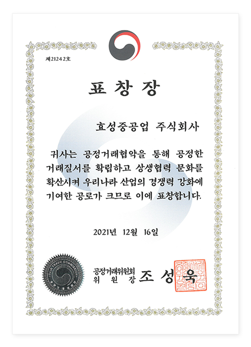 효성중공업이 공정한 거래 질서를 확립하고 상생 협력 문화 확산에 기여한 공로를 인정받아 공정거래위원회로부터 ‘2021년 최우수 기업 표창장’을 받았다. 효성중공업은 앞으로도 중소 협력 업체와 공정한 협력 관계를 이루기 위해 지속적으로 노력할 것을 다짐했다.