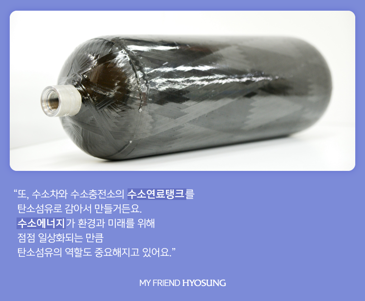 또한, 수소에너지의 핵심 소재도 탄소섬유잖아요. 수소차와 수소충전소에 필요한 수소연료탱크를 탄소섬유로 감아서 만들거든요. 그래야 고압으로 압축된 수소를 무사히 담아 저장할 수 있죠. 수소에너지가 미래를 위해, 환경을 위해 점점 일상화되는 만큼 탄소섬유의 역할도 중요해지고 있어요.