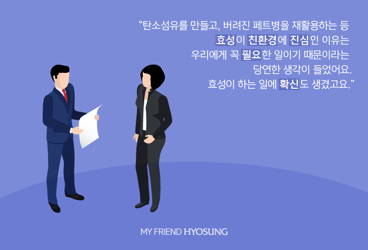 여전히 막연하고 잘 모르는 게 많아요. 아직은 신입사원이 벼슬인 시기지만, 언젠가는 자판기 과장님처럼 누르면 술술 나오는 날이 오겠죠? 그리고 효성의 진심을 잘 전달할 수 있는 날도요.