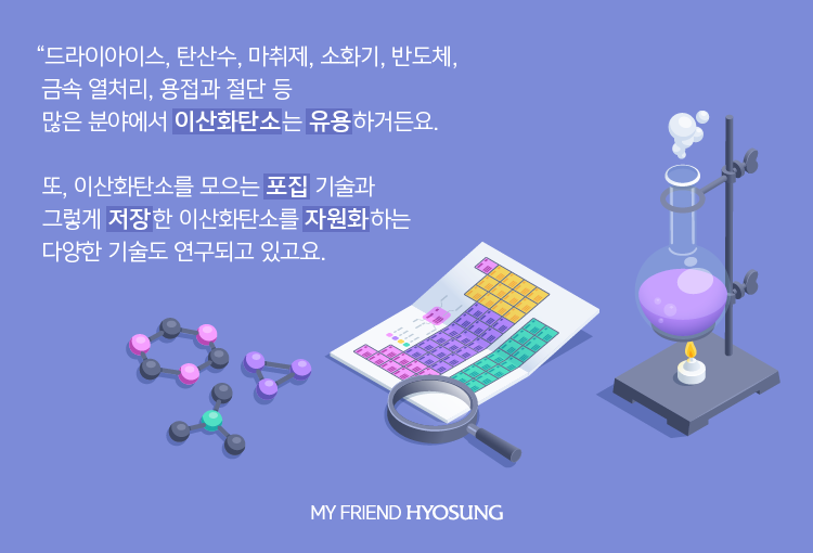 반면, 이산화탄소는 화석연료 사용으로 얻은 부작용이라 생각하겠지만, 태생부터 나쁜 건 아니에요. 드라이아이스, 탄산수, 마취제, 소화기, 반도체, 금속 열처리, 용접과 절단 등 많은 분야에서 이산화탄소는 유용하거든요.