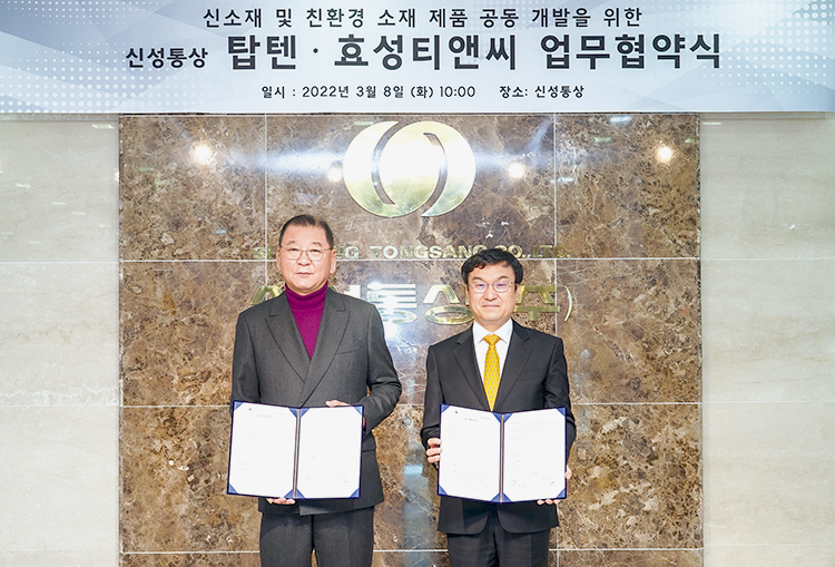 효성티앤씨가 3월 8일 국내 1위 스파 브랜드 ‘탑텐’을 생산하는 신성통상과 친환경 의류 개발을 위한 업무 협약을 맺었다. 이번 협업에서 효성티앤씨는 소재 공급뿐만 아니라 ‘리젠’을 적용한 신제품 개발에 참여해 친환경 패션 아이템을 함께 내놓을 예정이다. 탑텐은 레깅스와 브라톱 등 젊은 층이 선호하는 친환경 액티브 의류 라인을 선보이기로 했다.