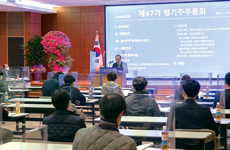 ㈜효성이 3월 18일 마포 사옥에서 제67기 주주총회를 개최했다. 효성그룹 사업회사 네 곳은 하루 앞선 지난 17일 제4기 주주총회를 열었다. 김규영 부회장은 올해도 코로나19 사태로 인해 대외 환경이 녹록지 않다고 진단하면서 “환경 변화에 정확하게 대응하는 기민한 조직으로 성장하겠다”고 밝혔다. 또 VOC 중심 경영을 실천하면서 브랜드 가치 차별화에 집중해 주주의 성원에 보답하겠다는 의지도 드러냈다. 이번 주주총회를 통해 효성티앤씨와 효성첨단소재는 각각 조현준 회장과 조현상 부회장 등을 사내 이사로 새로 선임했다.