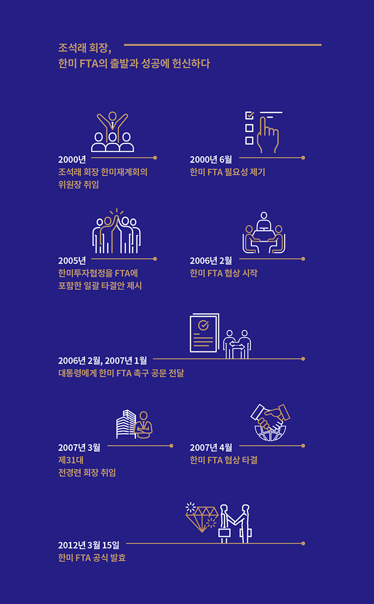 2000년 한미재계회의가 전경련으로 이관된 첫해 위원장을 맡은 조석래 회장은 당시 1997년 외환 위기를 완전히 극복하기 위해서는 기업별 경쟁력 강화도 중요하지만 우리 경제 전반의 체질을 개선하는 것이 필수라고 판단했습니다. 이에 세계 최대 시장과 경쟁력을 보유한 미국과의 연계를 강화하는 것이 살 길이라고 생각, 한미 FTA 추진을 결심하기에 이르렀죠. 2000년 6월 제13차 한미재계회의 총회에서 한미 FTA의 필요성을 처음 제기하고, 한미 FTA에 큰 관심이 없던 미국 측 경제인들을 설득해 공동 연구를 실시하게 한 이 역시 조석래 회장이었습니다. 그는 이후 회의마다 한미 FTA의 필요성에 대해 거듭 강조했습니다.