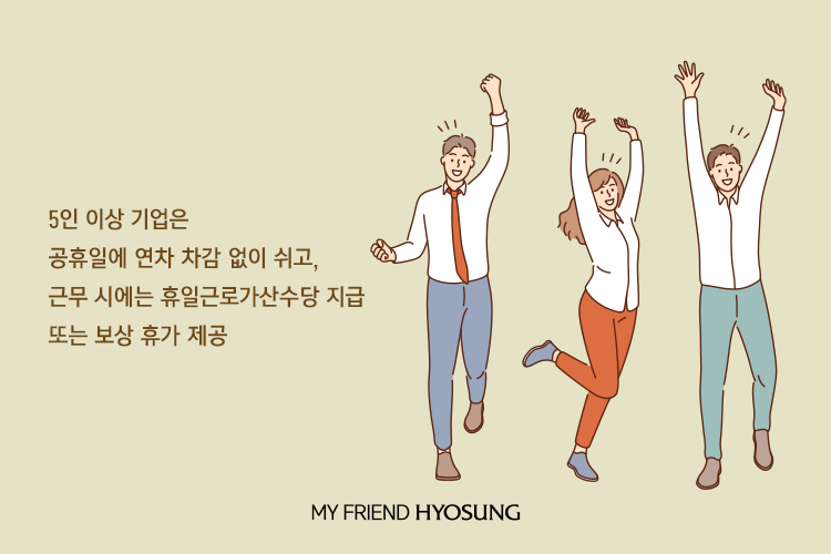 만약 불가피하게 공휴일에 일을 하게 되었다면, 가산수당을 주거나 공휴일 대신 다른 날을 유급 휴일로 대체해야 하는데요, 휴일근로가산수당 지급에 관한 법도 개정되었거든요. 공휴일에 일을 한 경우에는 통상임금의 1.5배 또는 보상 휴가가 제공되어야 합니다. 2022년부터는 비정규직이나 정규직 상관없이 5인 이상 사업장인 경우 의무적으로 지급해야 하죠.
