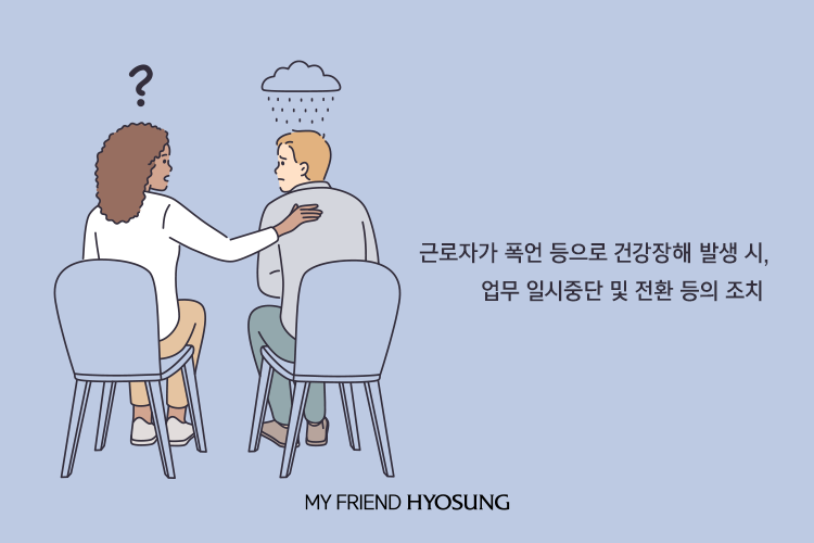 고객 응대를 해야 하는 근로자에게 큰 스트레스 중 하나는 폭언일 텐데요. 이제 근로자가 폭언 등을 통해 건강장해가 발생하면, 업무 일시중단 및 전환 등의 조치를 취해야 합니다. 이 조치는 경비원과 같은 일반 근로자들로도 적용 대상자가 확대되었고, 직장 상사의 폭언 등에도 적용됩니다. 휴게 시간 연장, 건강장해 치료 및 상담 지원, 고소 청구 등에 필요한 지원 등을 요구할 수도 있죠.