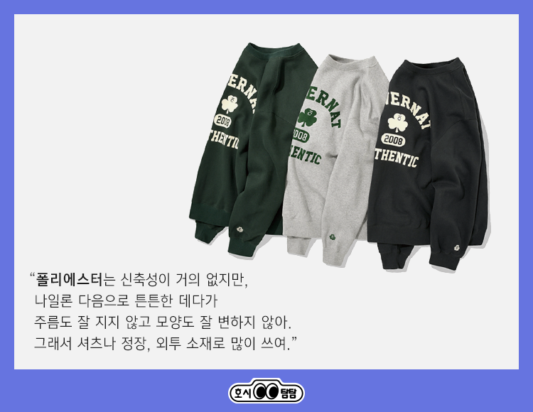 반면에 100% 폴리에스터는 거의 늘어나지 않아. 아는 것과 좀 다르지? 보통 폴리에스터로 만든 옷이라고 하면, 예를 들어 맨투맨 같은 건 잘 늘어난다고 생각하잖아. 그건 면, 마, 레이온과 같은 섬유와 혼방해 사용해서 그런 거야. 그래서 섬유와 섬유 사이 간격이 꽤 있는 편이지. 왜냐하면 신축성이 없으니까 실을 느슨하게 연결해서라도 어느 정도 유격이 있게 만드는 거야. 튼튼하고 세탁 후에도 잘 구겨지지도 않아서 관리하기도 편해.