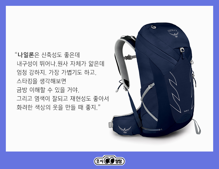 “응, 나일론은 신축성도 좋은데 내구성이 가장 뛰어나. 가장 가볍기도 하지. 부드럽고 광택이 풍부한 것도 특징이야.”