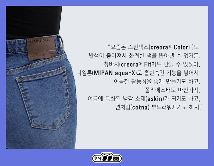 “요즘은 스판덱스(creora® Color+)도 발색이 좋아져서 화려한 색을 뽑아낼 수 있거든. 청바지(creora® Fit²)도 만들 수 있잖아. 땀을 흡수하지 못하는 나일론(MIPAN aqua-X)도 흡한속건 기능을 넣어서 여름철 활동성을 좋게 만들기도 하고. 폴리에스터도 마찬가지. 여름에 특화된 냉감 소재(askin)가 되기도 하고, 면처럼(cotna) 부드러워지기도 하지.”