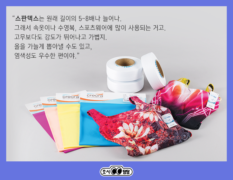 “그렇지. 원래 길이의 5~8배나 늘어난다고. 그래서 속옷이나 수영복, 스포츠웨어에 많이 사용되는 거고. 고무보다도 강도가 뛰어나고 가볍지. 올을 가늘게 뽑아낼 수도 있고, 염색성도 우수한 편이야.”