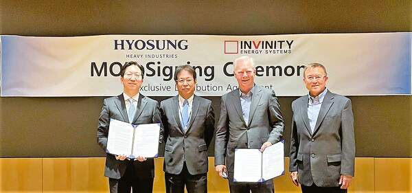 효성중공업이 영국 배터리 업체인 ‘인비니티 에너지 시스템즈’와 바나듐 배터리 기반 ESS 공급을 추진하는 MOU를 맺었다. 이번 협약을 통해 효성중공업은 국내 시장에서 인비니티 제품을 독점으로 판매할 수 있는 지위와 해외 시장에서도 판매할 수 있는 비독점적 권리를 갖게 됐다. 이를 토대로 효성중공업은 전 세계 ESS 시장에서 영향력을 넓혀갈 것으로 기대된다.