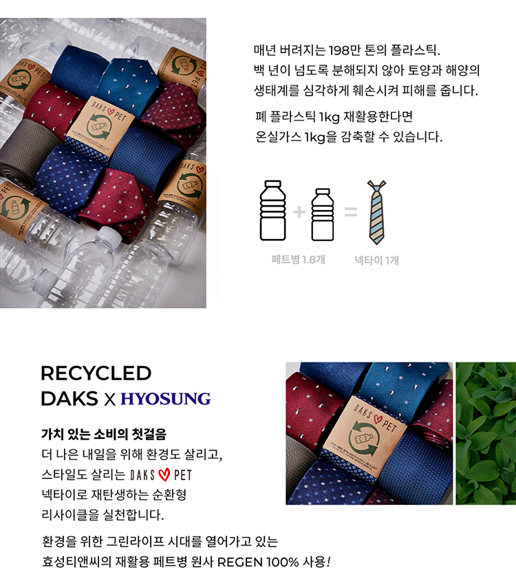 올해 2월에는 닥스셔츠의 친환경 넥타이 컬렉션 ‘닥스 러브 페트(DAKS LOVE P.E.T.)’, 이어 4월에는 무신사 스탠다드의 ‘그린 라인’이 차례로 출시되었죠. 버려진 플라스틱 병이 양질의 원단으로, 그리고 스타일리시한 패션 아이템으로 바뀌는 자원의 선순환! 효성이 패션 브랜드들과 협업을 지속하는 이유입니다.