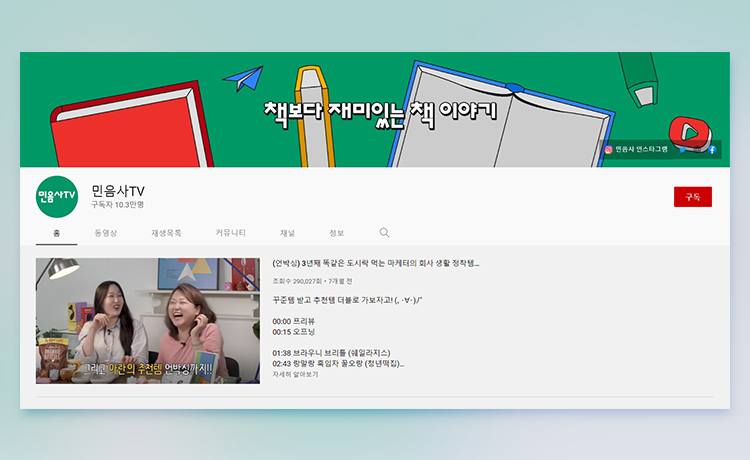 출판사 하면 다소 고상하고 차분한 이미지가 떠오르곤 하죠. 이러한 편견을 부수며 트렌디한 콘텐츠로 독자들의 시선을 사로잡은 민음사의 <민음사TV>는 ‘책보다 재미있는 책 이야기’라는 컨셉으로 출판과 책에 관련된 다양하고 흥미로운 주제들을 선보이고 있어요.