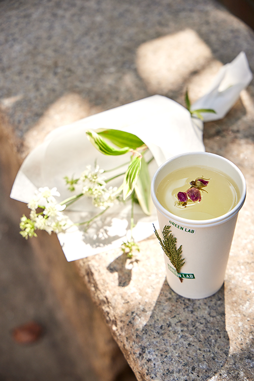 그린랩은 쉼을 위한 공간인 만큼 다양한 체험형 프로그램을 제안한다. ‘나만의 서울숲 즐기기’ 외에도 식물과 함께하는 원데이 클래스가 있다. 오감 만족을 위한 ‘플라워 리추얼 코스’가 그것이다. 우선 ‘차, 향, 꽃’ 프로그램은 향기로운 꽃차를 마시고 인센스를 태우며 계절 꽃으로 침봉꽂이를 하는 수업이다. 침봉꽂이는 환경에 유해한 플로럴폼 대신 지속 가능한 침분을 이용한 꽃꽂이다. 또 다른 프로그램으로 ‘이끼분’ 만들기가 있다. 식물을 화분에 심지 않고 뿌리를 이끼로 감싸 구 형태로 식재하는 방법으로 이뤄진다.