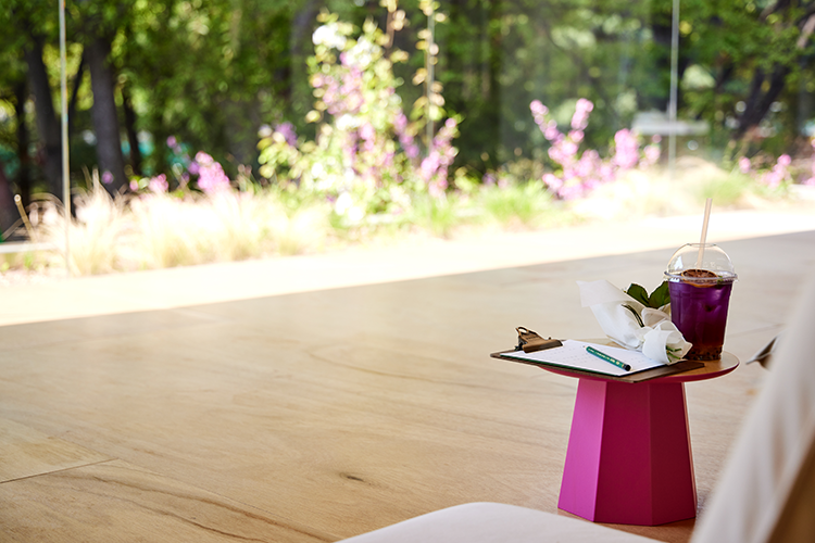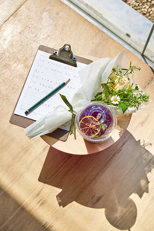 2층 스튜디오에서는 누구나 예약을 통해 참여할 수 있는 ‘나만의 서울숲 즐기기’ 프로그램을 진행한다. 체험자들에게는 계절 음료와 즐길 거리를 담은 바구니를 대여한다. 그린랩이 큐레이션한 책과 미니 꽃다발, 종이와 필기구 등이다. 바구니를 받아들고 2층 스튜디오에 도착하면 원하는 자리에 앉아 90분을 누리면 된다. 책을 읽든 글을 쓰든, 가만히 ‘숲멍’을 하든 자유다. 다만 혼자만의 시간을 온전히 누릴 수 있도록 휴대전화 사용과 대화를 금지하고 있다. 본 프로그램은 금요일과 주말에 예약이 집중되는 편이라 그 외 요일을 선택하면 좀 더 여유롭게 공간을 즐길 수 있다.