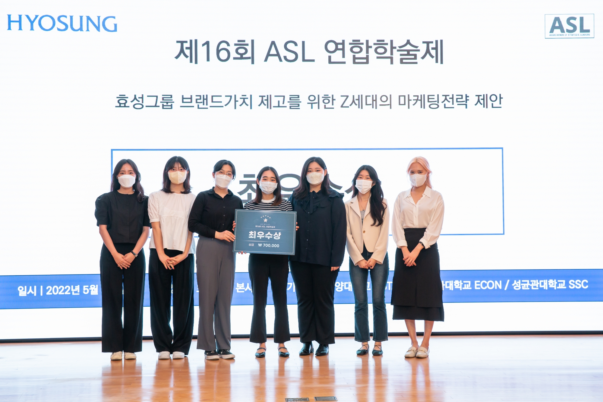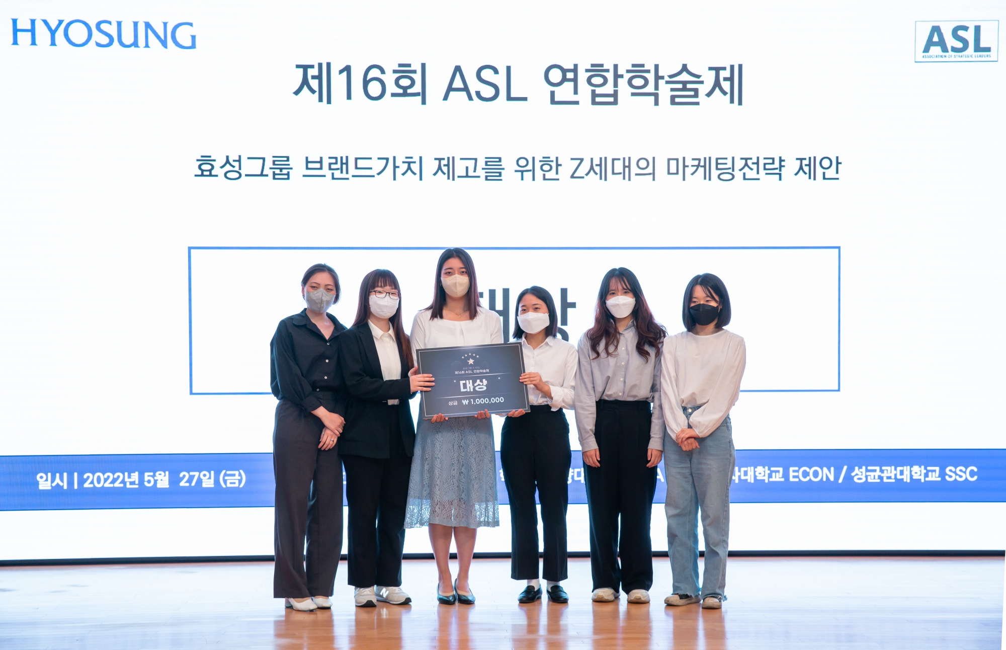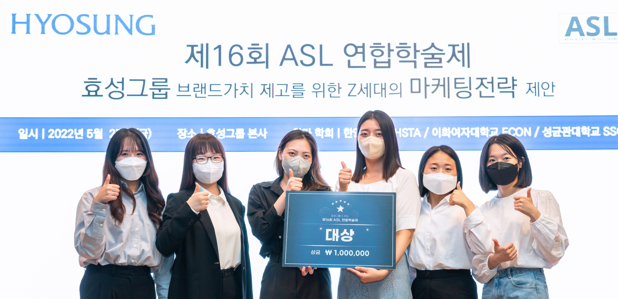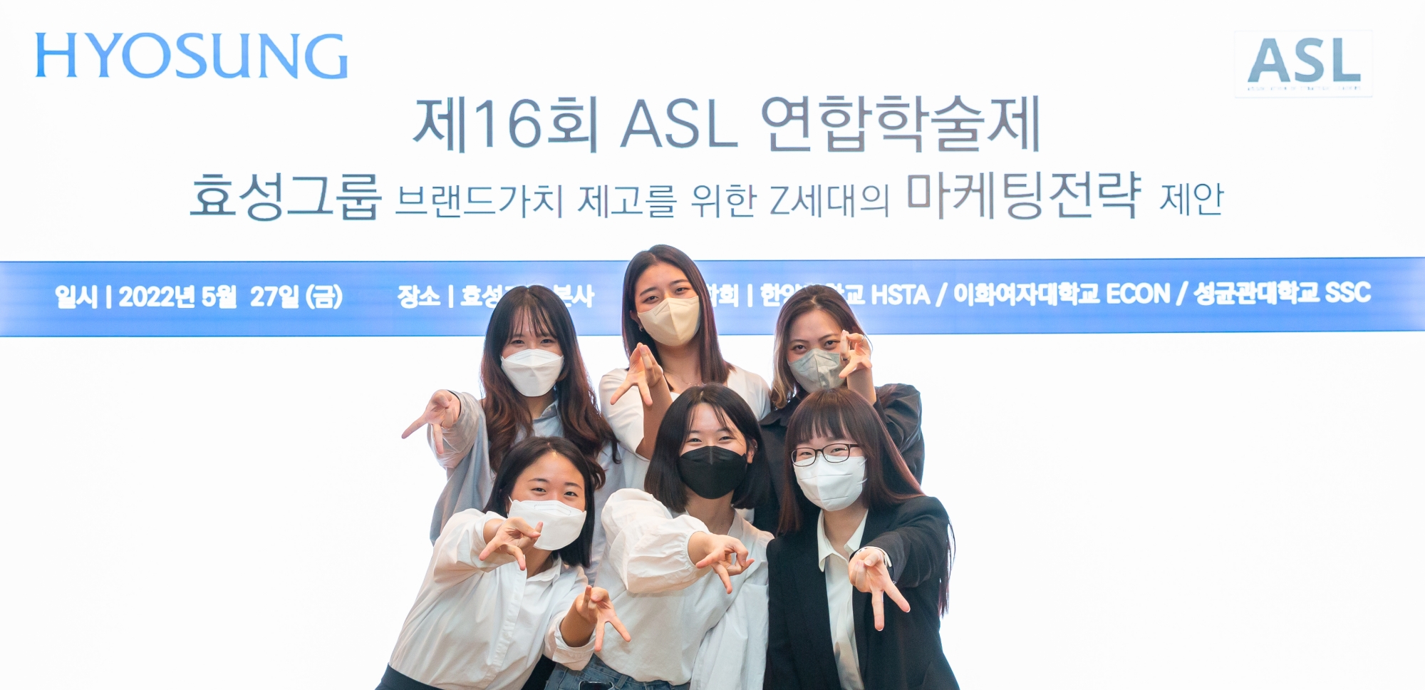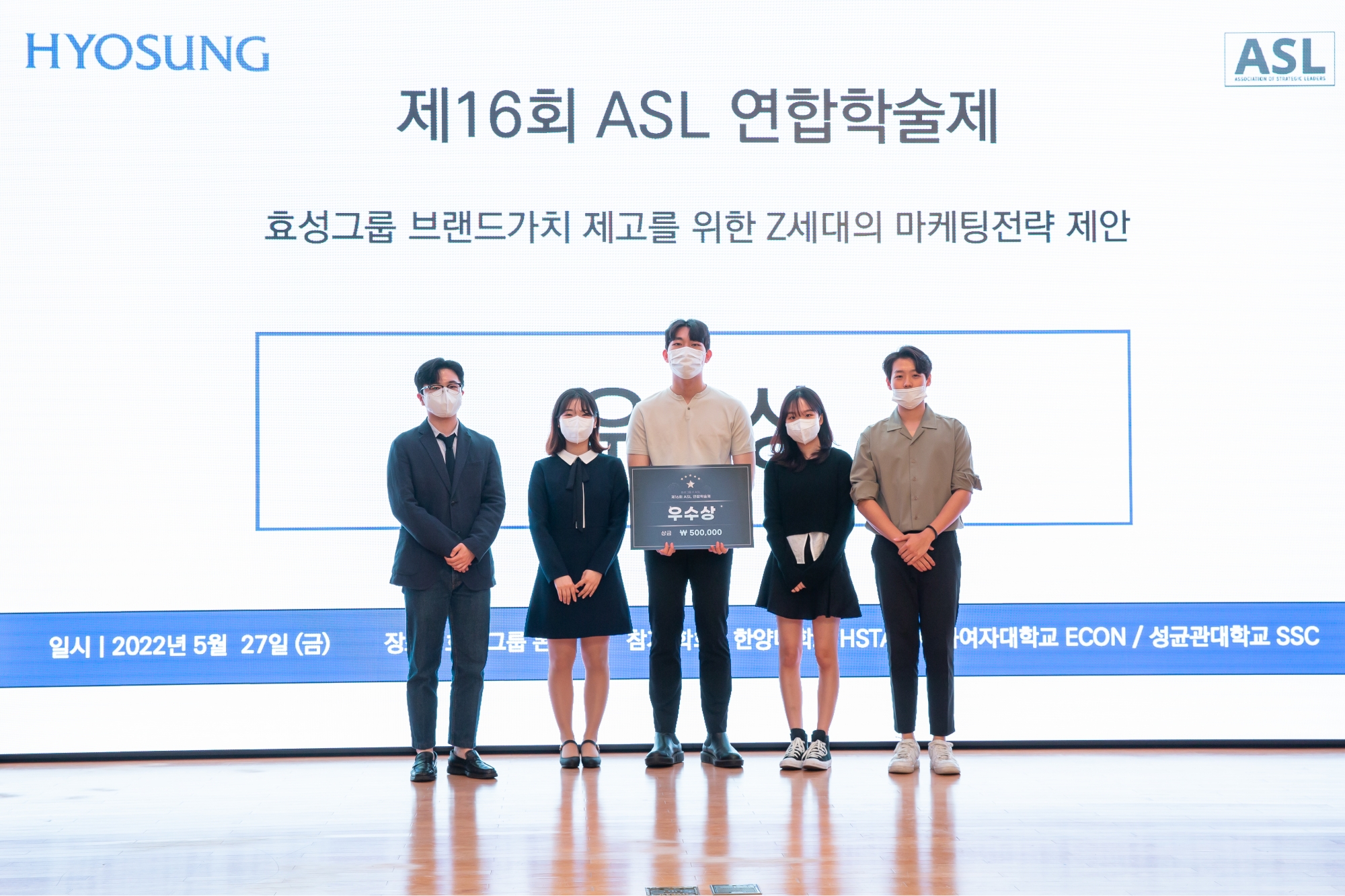 효성 브랜드의 인지도 확장과 가치 제고를 위한 대학생 마케팅 전략 발표회 및 시상식이 지난 5월 27일 효성 본사 대강당에서 열렸습니다. 이번 행사는 ASL[Association of Strategic Leaders; 한양대학교 경영전략사고학회(HSTA), 이화여자대학교 경영전략컨설팅학회(ECON), 성균관대학교 경영전략컨설팅학회(SSC) 연합]과의 협력 프로젝트로 진행됐습니다.