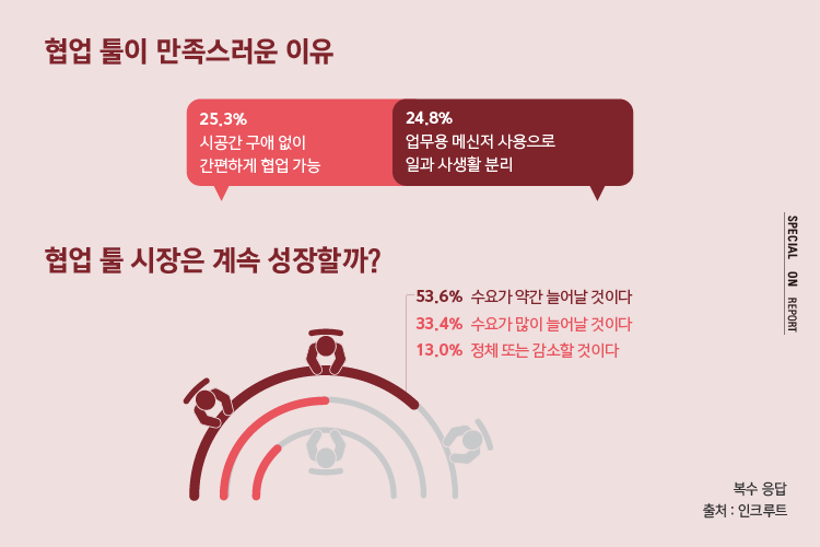 재택근무가 보편화되면서 협업 툴 시장도 급성장했습니다. 직장인 응답자의 71.5%가 현재 협업 툴을 사용 중이며 대부분 만족(88.8%)하는 것으로 나타났죠. 협업 툴 기능 중 자주 활용하는 것은 메신저, 자료 공유, 업무 상황 확인, 공지 사항 전달, 화상 회의 순으로 조사됐습니다. 코로나가 종식돼도 비대면 중심의 협업 툴은 업무의 보완재로서 수요가 증가할 전망입니다.