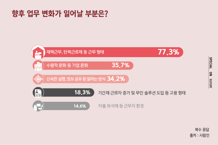 코로나19로 인해 변화한 근무 환경과 더불어 직장인의 인식 변화를 들여다봤습니다.