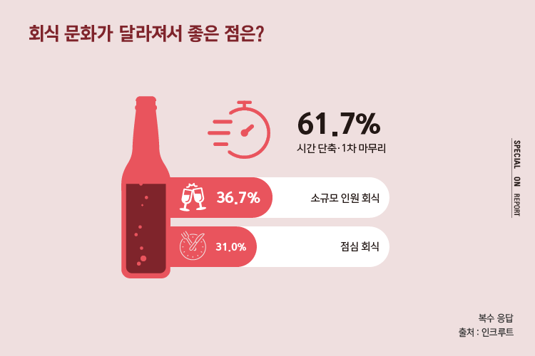 코로나19 장기화로 직장인 회식 문화에 많은 변화가 있었다. 방역 규제가 강화되면서 회식 횟수나 음주량이 확연히 줄고, 회식 시간도 음주 없는 점심 회식이 늘었습니다. 이러한 변화에 직장인 5명 중 4명은 코로나19 전후를 비교하면 회식 스트레스가 줄었다고 응답했죠. 엔데믹 전환으로 회식이나 야유회가 부활하는 요즘. 직장인 대부분은 회식의 반가움보다 ‘저녁이 있는 삶’이 지속되길 희망하고 있습니다.