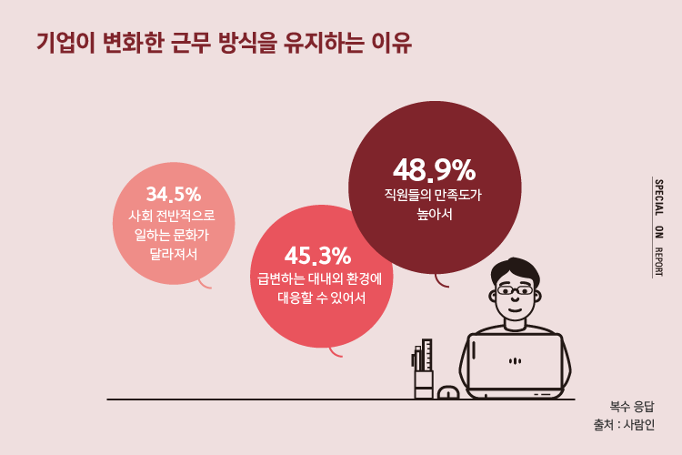 코로나19와 함께 기업의 일하는 방식은 대면 회의 대신 메신저•화상 회의 진행, 재택 등 원격 근무 실시, 탄력•선택근로제 도입 등으로 변화했습니다. 이러한 변화를 직장인들은 매우 긍정적(74.9%)으로 바라봤죠. 그래서일까? 기업 10곳 중 7곳(69.5%)은 코로나19 종식 후에도 변화한 근무 방식을 유지한다고 밝혔습니다.