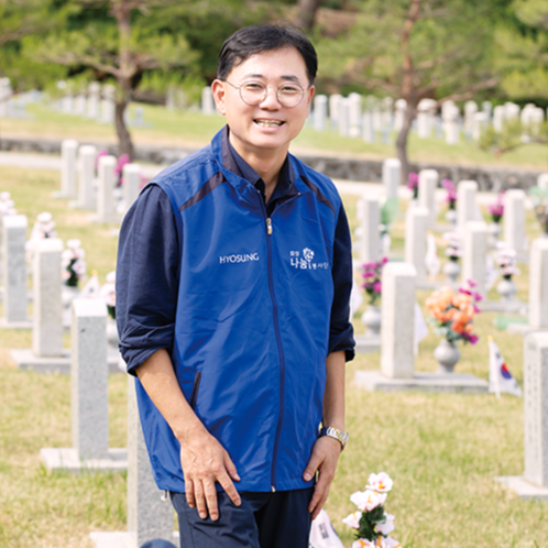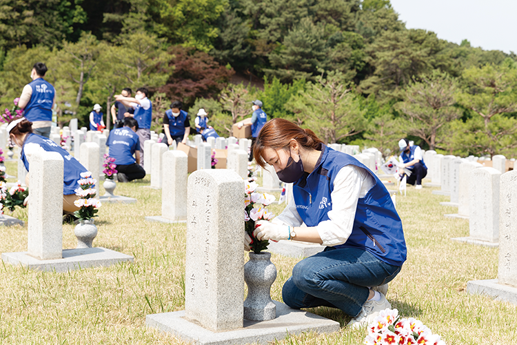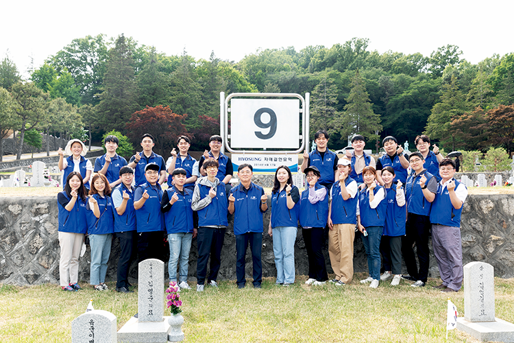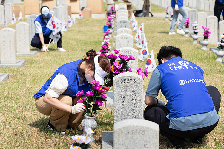 효성은 2014년부터 호국 보훈 사회공헌 활동의 일환으로 본사 인근의 국립묘지인 국립서울현충원과 1사 1묘역을 체결, 연 2회 정화 활동을 실시해왔습니다. 또한 세종•옥산•대전공장은 국립대전현충원, 구미•대구공장은 국립영천호국원과 자매결연 협약을 맺고 묘역 정비 활동을 진행하고 있죠.