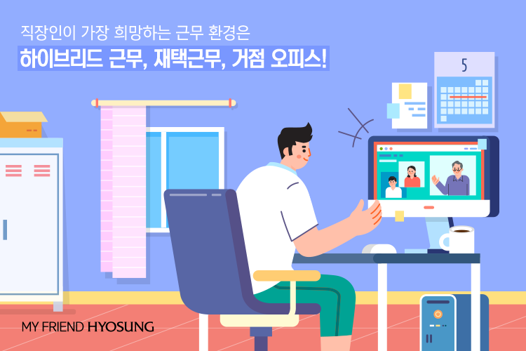 최근 잡코리아에서 근무 환경에 대한 설문조사를 실시했는데요. 직장인 412명을 대상으로 ‘코로나 시대 근무 환경 변화에 대해 어떻게 생각하는지’ 물어본 결과, 무려 86.9%가 ‘긍정적’이라고 답했고, 가장 희망하는 근무 환경으로 출근과 재택을 혼합한 ‘하이브리드 근무’(68.5%)를 꼽았어요. 다음으로는 재택근무(38.7%), 게다가 집과 근접한 곳에 위치한 거점 오피스 근무를 희망하는 직장인도 무려 29.1%나 차지했습니다.