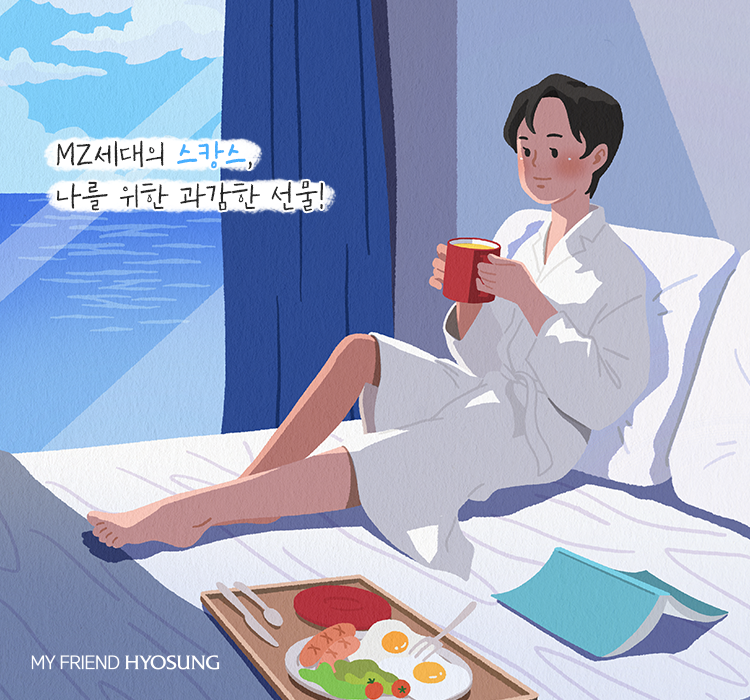 나는 호캉스 위에 뛰는 ‘스캉스(스위트룸+바캉스)’가 있습니다. 치솟는 비행기 티켓 값도 부담스럽고, 아직 안심할 수 없는 코로나에 호텔에서 휴가를 보내려는 MZ세대 중에는 1박에 100만 원이 훌쩍 넘는 스위트룸도 많이 찾는다고 해요. 이에 여러 호텔에서는 앞다투어 스위트룸을 패키지 상품으로 선보이고 있어요. 서울에 있는 한 특급호텔의 1,000만 원 패키지 상품은 호텔 내 단 하나뿐인 최상위 스위트룸에서의 1박과 함께 프라이빗 픽업, 한강 요트 체험, 1인당 40만 원 상당의 호텔 파인다이닝 디너, 최고급 샴페인 돔 페리뇽 등으로 구성된 페어링 플래터 등을 제공하여 오히려 가성비가 좋다는 얘기까지 나오고 있어요.
