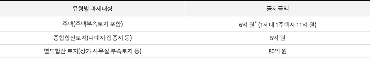 예를 들어 공시가 6억 원의 주택을 소유하고 있다면, 1세대 1주택자는 11억 원까지가 공제금액이기 때문에 재산세는 부과되지만 종합부동산세는 부과되지 않습니다. 또 1세대 1주택자가 공시 가격 12억의 주택을 소유하고 있다면, 12억에 대한 재산세를 내면서 동시에 11억 원을 초과한 1억 원에 대한 종합부동산세도 내야 하는데요, 이 경우 이중과세이기 때문에 이미 납부한 재산세 중 1억 원에 해당하는 부분은 빼주는 절차를 거칩니다.