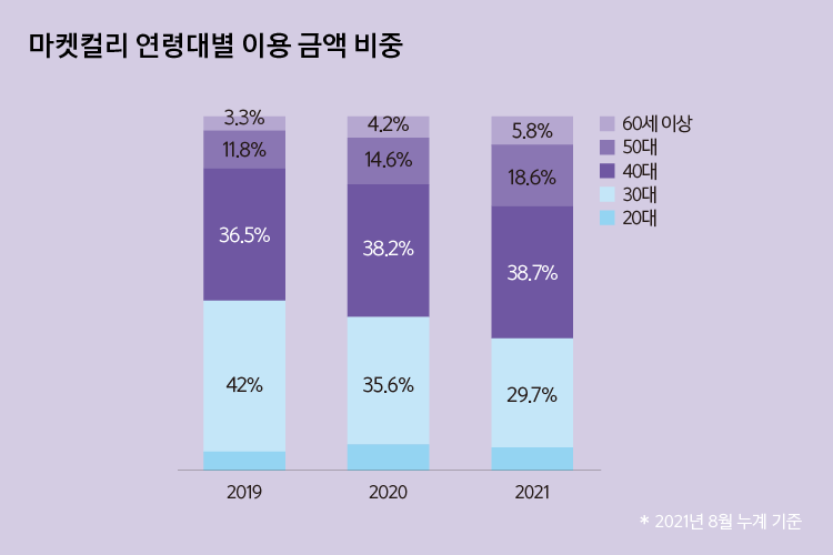 ‘세대별 온라인 소비 행태 변화’ 보고서에서 2019년과 2020년 사이 온라인 결제 건수와 결제액 증가율 1위 세대는 50대와 60대였습니다. 실버 서퍼(Silver Surfer), 웹버족(Webver, 인터넷을 뜻하는 Web과 Silver의 합성어) 역시 이러한 특징을 보여주는 신조어. 메리츠증권에 따르면 마켓컬리의 50~60대 사용 비중은 2019년 15.1%에서 2021년 8월 24.4%로 9.3%포인트 상승했습니다.