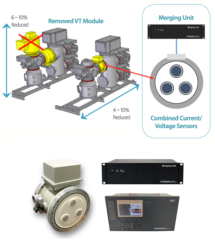 효성중공업이 개발한 LPIT는 GIS 모듈 내 일체형 전압 전류 센서를 적용한 제품으로 기존 철심형 변류기와 변성기 대비 정밀도가 뛰어나고, 부피 및 SF6 가스 양을 60% 줄일 수 있습니다. 또 MU를 통한 데이터 통신 기반 디지털화로 제어 케이블 및 트레이 사용량을 절감하고, 예방진단•자산관리 시스템 등 신기술 적용이 용이하며, 제어•보호반의 축소를 통한 공간 절감 효과도 있습니다.