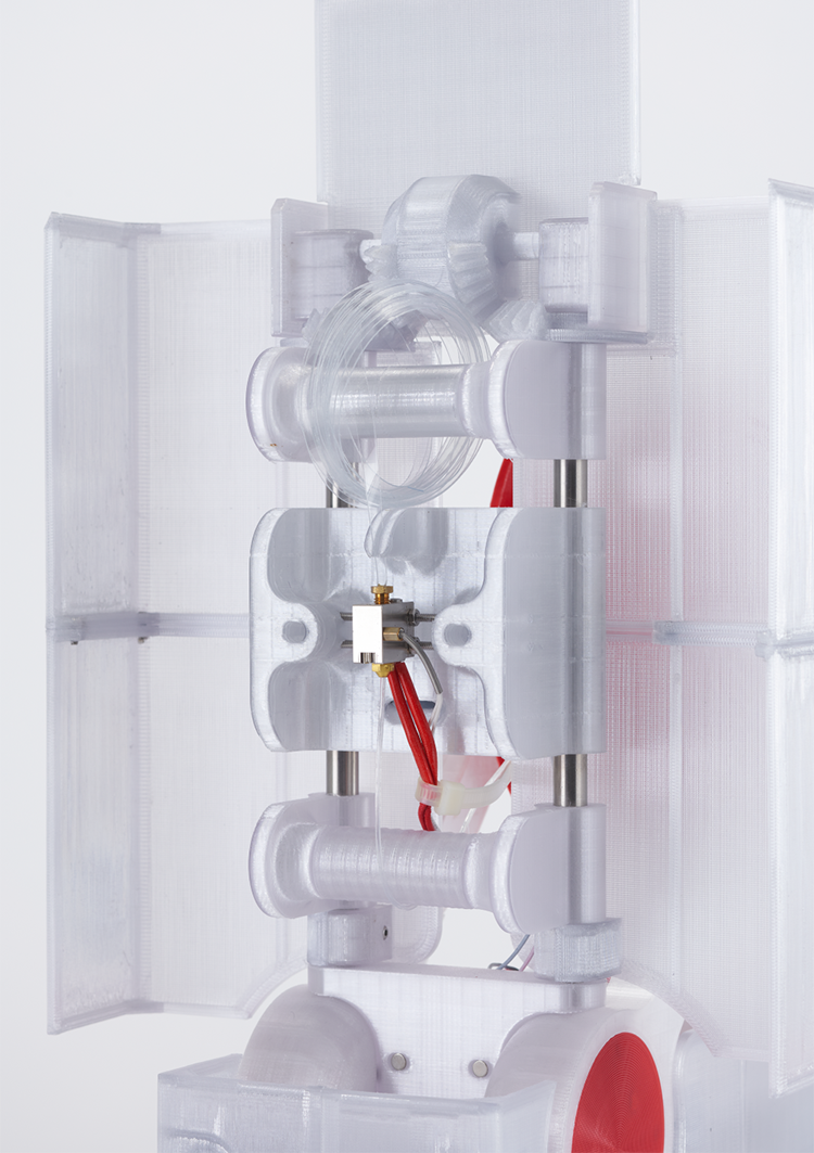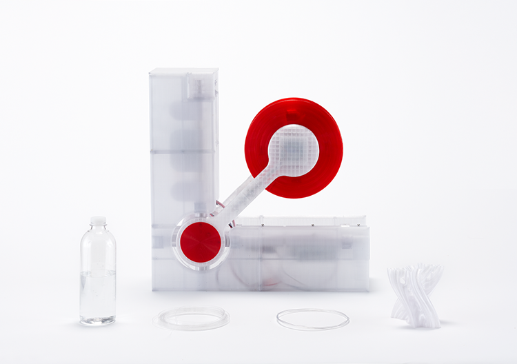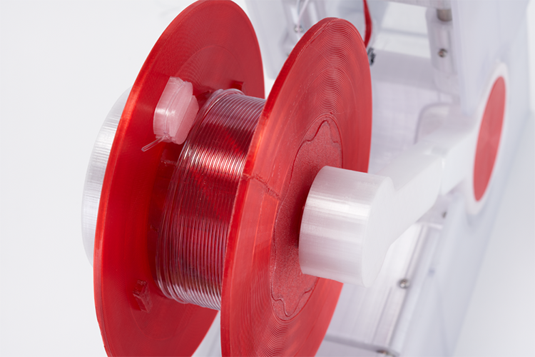 작동 방식은 간단히 살펴보면, 우선 베어링을 맞물려 만든 슬라이서로 페트병을 긴 띠 모양으로 잘라냅니다. 그리고 그 끝을 기계 내부의 핫엔드(hotend, 플라스틱 칩을 녹여 짜내는 부품)에 연결한 후 기계를 작동시키면 열 성형 과정을 거쳐 반대쪽 청동 노즐 끝에서 1.75mm 규격의 필라멘트로 사출됩니다. 그렇게 나온 필라멘트가 모터로 구동되는 실패에 착착 감기면 3D 프린터로 옮겨질 준비가 마무리되는 거예요. 3D 프린터만 있으면 우린 이것으로 새로운 제품을 만들 수 있습니다.