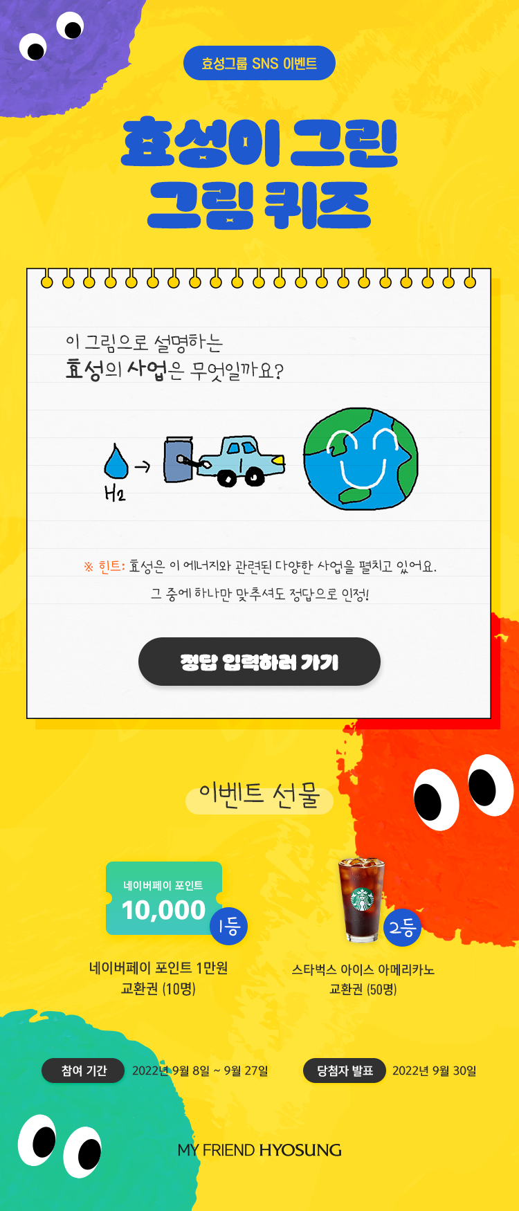 | [당첨자 발표] 효성은 수소와 함께하는 미래라는 ‘큰 그림’을 그립니다! (0) | 2022.09.30 |