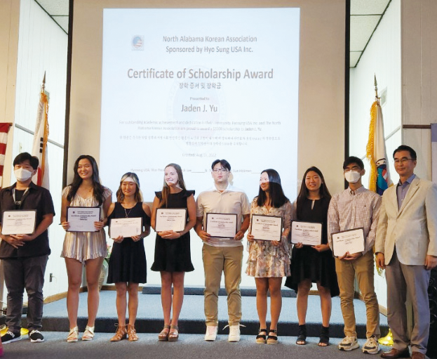 효성USA가 8월 13일 현지 법인이 있는 앨라배마주의 헌츠빌, 메디슨 인근의 지역사회 내 고등학생 8명을 선발해 장학금을 전달했다. 이는 광복절 기념행사의 일환으로, 지역 내 우수 학생 중 가정환경이 어렵거나 지역사회에 공헌한 계층의 자녀, 6•25 참전 용사의 직계 자손 등을 대상으로 선발했다.