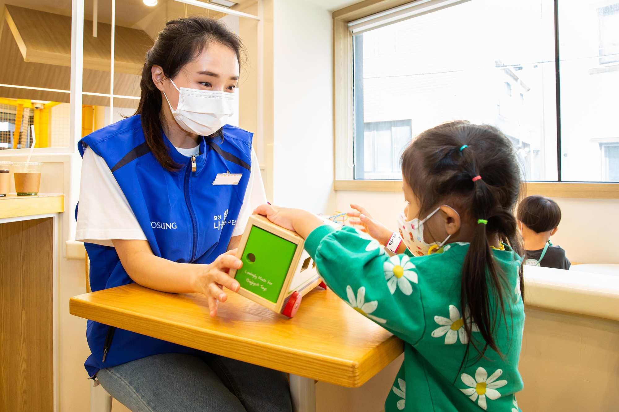 효성 임직원의 자발적인 참여로 구성된 효성나눔봉사단은 2013년 5월 발족한 이후로 월 1회 이상 장애•비장애 통합 어린이집인 구립장군봉어린이집(구 성민장애아동어린이집)을 찾아 장애 원아들의 외부 활동을 돕고 있습니다.