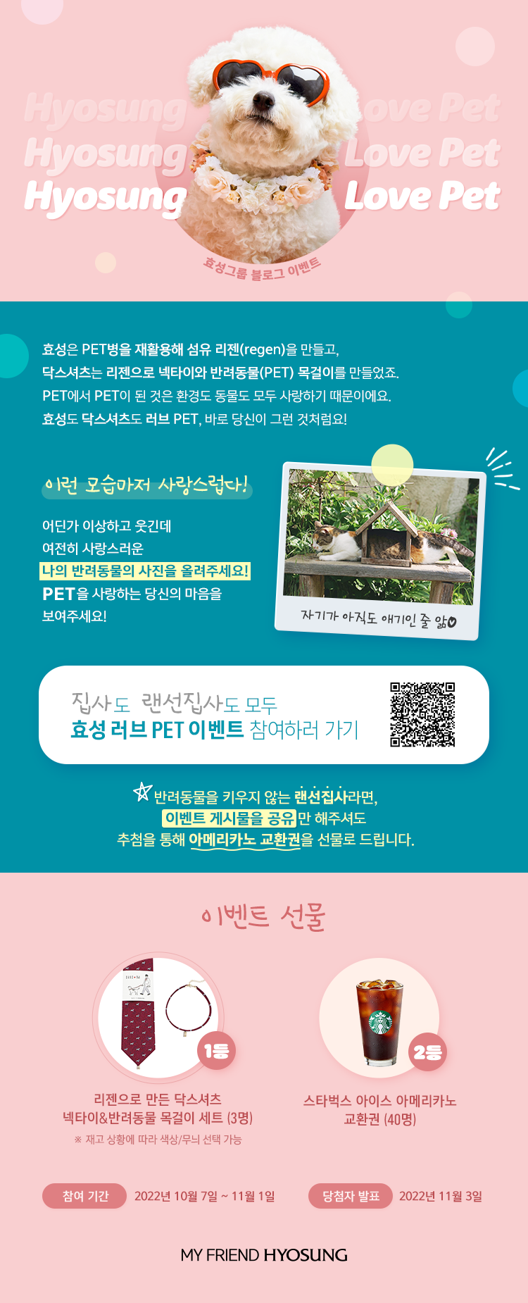| [당첨자 발표] 효성도 당신도 러브 PET, 환경도 동물도 모두 사랑합니다! (0) | 2022.11.03 |