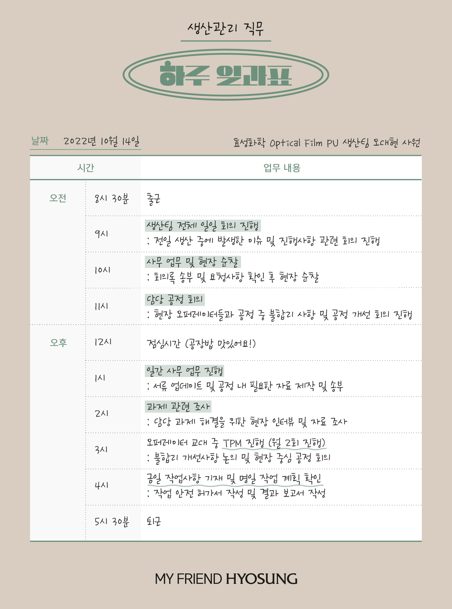 하루 일과표로 보는 효성 직무별 현실 업무: 생산관리 편