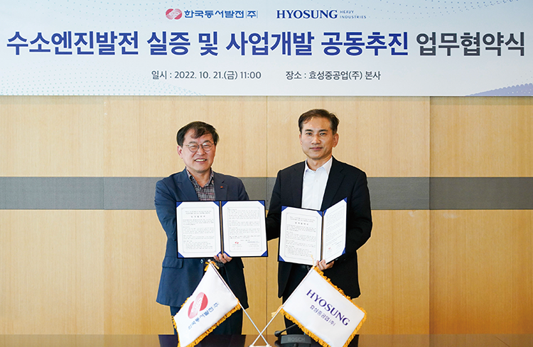 효성중공업이 10월 21일 한국동서발전과 수소 엔진 발전기 실증 및 사업 개발 협력 관련 업무 협의를 체결했다. 이번 MOU를 통해 효성중공업과 한국동서발전은 태양광 발전과 수소 엔진 발전, ESS 그리고 수전해 설비의 장점을 접목한 분산 전원 무탄소 발전 시스템 실증 및 사업 개발을 공동으로 수행한다.