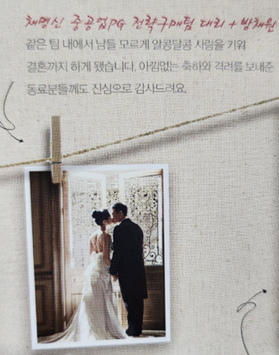 2011년 같은 팀이었던 남편과 사내 결혼으로 사보에 실린 적이 있습니다. 11년이 지났지만 이 사보만큼은 계속 소장하고 싶더라고요. 이제는 전우(?)처럼 살고 있는 우리의 모습을 떠올리며 그날의 사진을 보내봅니다.