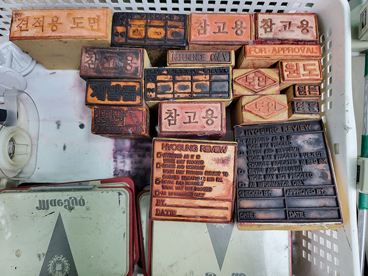 4차 산업혁명과 함께 이제는 거의 사용하지 않는, 사라져가는 ‘고무도장’입니다. 손으로 도면을 그리던 시절부터 고무도장은 반복 패턴을 위한 중요한 도구였습니다. 먼지가 쌓인 채 사무실 구석을 지키는 이 고무도장들에게 반세기 효성의 역사에 대해 인터뷰한다면 어떤 이야기를 들려줄지 사뭇 궁금하네요.