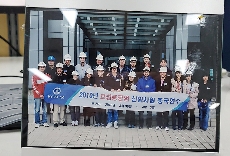 제 소장품은 제가 입사한 2010년도 신입 연수 중 1등 조로 뽑히면서 부상으로 중국 연수를 다녀왔을 때 찍은 기념사진입니다. 신입사원에게 정말 파격적인 혜택이었죠. 사진 속 동기들 중 여전히 제 곁에서 함께 일하고 있는 동기들도 있다는 사실! 사진처럼 앞으로도 효성과 좋은 추억을 많이 남기고 싶습니다.