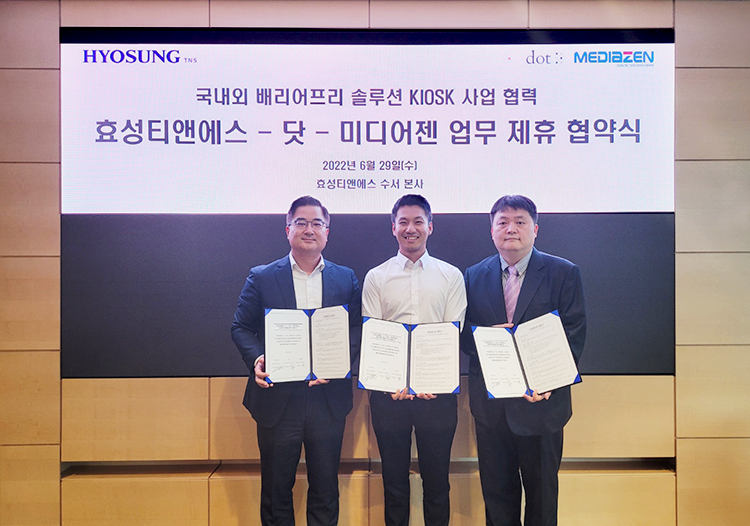 효성티앤에스는 지난 6월 배리어프리 키오스크 출시를 위해 시각장애인용 점자 기술을 보유한 기업 ‘DOT’ 및 AI 음성 인식에 특화된 ‘미디어젠’과의 업무협약을 시작으로, 12월 민원 신청형 배리어프리 키오스크 출시를 앞두고 있습니다.