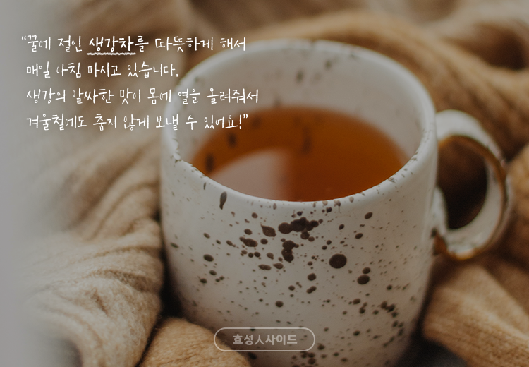 “꿀에 절인 생강차를 따뜻하게 해서 매일 아침 마시고 있습니다. 생강의 알싸한 맛이 몸에 열을 올려줘서 겨울철에도 춥지 않게 보낼 수 있어요!”