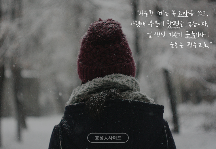“추운 날 외출할 때는 꼭 모자를 쓰고, 아랫배 부분에 핫팩을 넣습니다. 열 생산 기관이 근육이라니 운동은 필수고요.”
