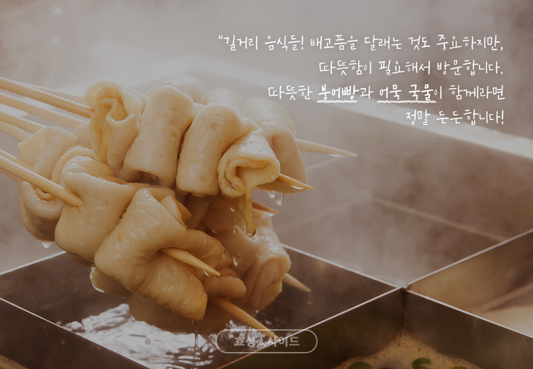 “길거리 음식들!!! 붕어빵, 어묵 등등등.. 추운 겨울 칼바람을 맞고 있다 보면 길거리에 보이는 포장마차들에게 눈이 절로 갑니다. 겨울에는 배고픔을 달래는 것도 중요하지만, 따뜻함이 필요해서 방문합니다. 추운 겨울... 따뜻한 붕어빵과 어묵 국물이 함께라면 정말 든든합니다!”