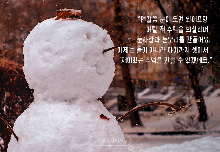 “연말쯤 눈이 오면 와이프랑 나가서 어릴 적 추억을 되살리며 눈사람과 눈오리를 만들어요. 제가 몸통, 와이프가 머리를 만들고, 나뭇가지로 손을, 나뭇잎으로 눈코입을 만들어주면 꽤나 귀여운 눈사람이 완성됩니다. 옆에는 눈오리를 만들어서 같이 놔두면 더더욱 귀엽고 연말 좋은 추억이 돼요. 이제는 둘이 아니라 아이까지 같이 셋이서 재미있는 추억을 만들 수 있겠네요^^”