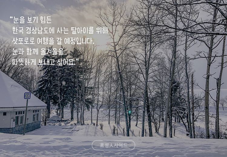 “눈을 보기 힘든 한국 경상남도에 사는 딸아이를 위해 삿포로로 여행을 갈 예정입니다. 눈과 함께 올겨울을 따뜻하게 보내고 싶어요.”
