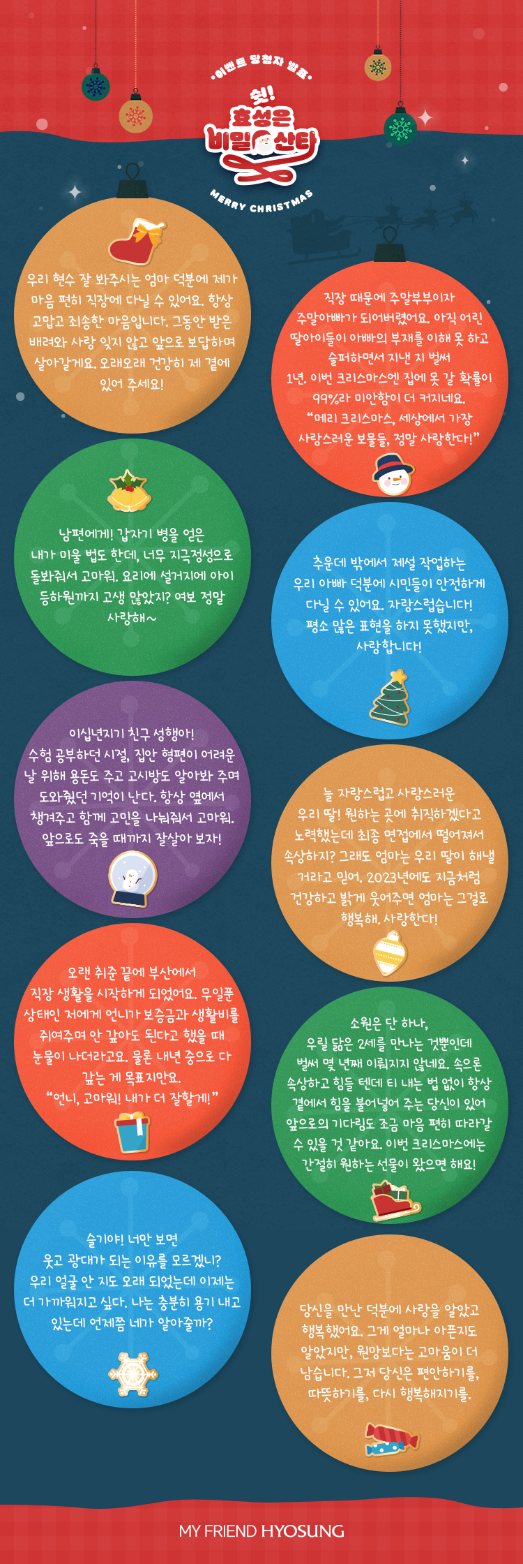 비밀산타 효성에게 사연을 의뢰해주셔서 고맙습니다. 비록 당첨되지 않으셨더라도 이번 크리스마스에 여러분의 진심을 직접 전할 수 있기를 응원합니다. 그럼, 행운의 당첨자를 발표합니다.